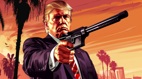 GTA 5 loading screen freaturing George W. Bush, typical art work --ar 16:9