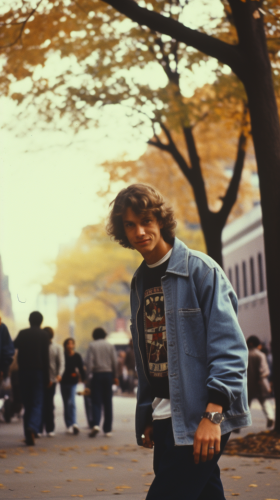 35mm faded photograph 1980s new york, people skateboarding in 80s skater outfits, graffiti on the wall in background, autumn leaves, 35mm faded vintage photo --ar 9:16