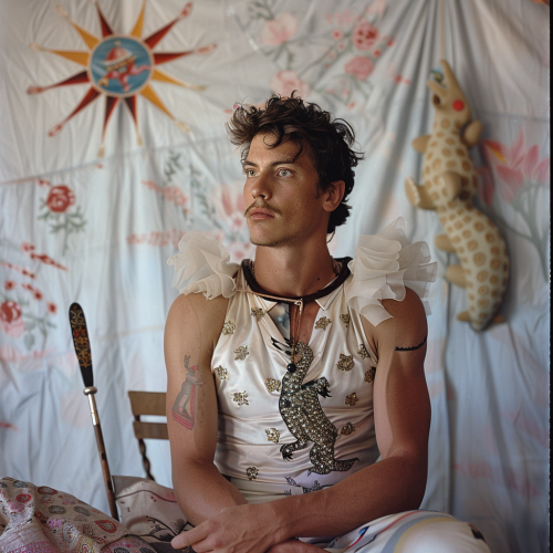1980s style photography retro futuristic cinematic pastel tones photography 35mm kodak cinematic tones. freckled freckled David Gandy, sitting on a chair, wearing a white silk tank top decorated with metal bullion animals. he wears a tulle collar around his neck. . white wall with painted vintage circus, firecracker, cannon, circus tent, woman swallowing swords. she has an albino alligator in her arms.
