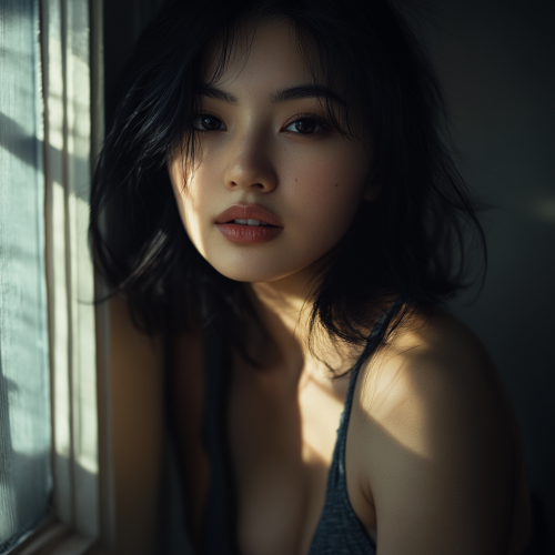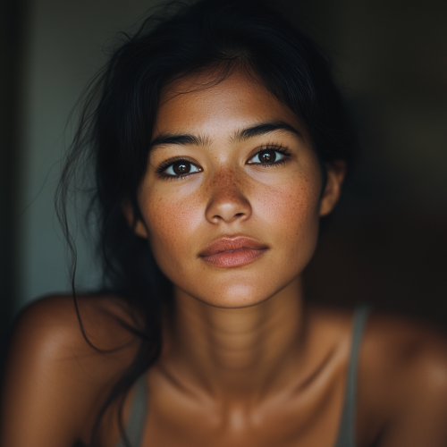 A lifelike photograph of a 28-year-old woman with black hair, medium build, upper body visible from head to below the chest, looking directly at the camera. The image highlights detailed skin and hair textures, soft, diffused lighting that enhances natural features, subtle background blur, Sony A7R IV, 35mm lens, f/2.8 aperture --style raw