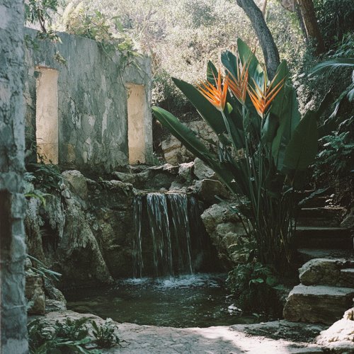35mm color film photograph of solstice canyon ruins of midcentury ranch home in malibu, surrounded by foliage and waterfall including large bird of paradise plants