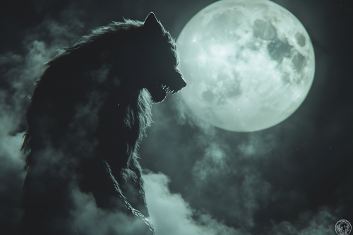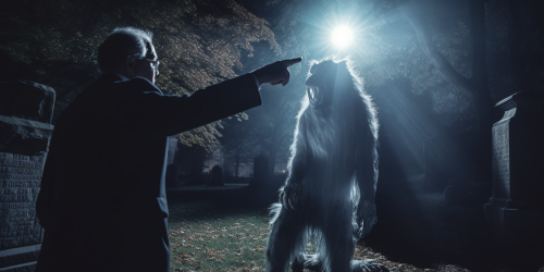 35mm photograph, the camera angle is pointing over a man's shoulder, the man is pointing at a screen, on the screen is displayed a rough rendering of a man being confronted by a large monstrous Dog Man outside a moonlit cemetery, the Dog Man is awkward looking and stands on his hind feet upright, --ar 6:3 --style raw