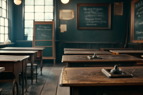 A 35mm film-style photograph of a Victorian-era school classroom, featuring individual wooden desks with inkwells. The room is highly detailed, capturing the early 1900s English style, with soft lighting illuminating the worn wood and chalkboard. The atmosphere is nostalgic and academic. --ar 3:2