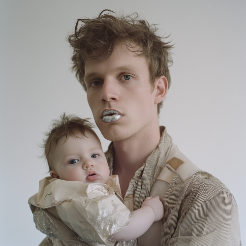 35mm portrait picture shot in a clean studio space filled with natural light, of a young model man with a silver lipstick with a baby on his arms (the baby is also wearing a lipstick). shot in the style of photographer Wolfgang Tillmans