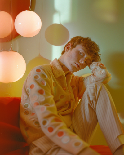 70s photoshoot, fashion magazine cover photo, abstract, surrealist outfit, high fashion, weird ambient lighting, soft colors, 35mm photography, stanley kubrik set design, clean, extra saturation, iso 400, Kodak Ultramax --ar 4:5 --v 6.0