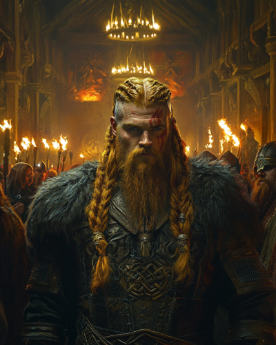 Panoramic 35mm, photorealistic, face view of a full body, young Tall viking hunter (Equal mix of Chris Pratt, Chris Hemsworth and Russel Crowe) with Braids long red hairs and long red beard, wearing high detailed leather clothes with Celtic's patterns in middle of a viking's Thing in Wooden Throne Hall with crowd, lite on torches on walls --ar 4:5 --v 6.1