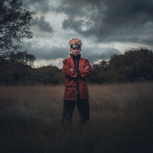 full body image of Naruto standing with his arms folded in the middle of a field, dark fantasy themed shot with a Sony A7R IV and a high-resolution 35mm wide-angle lens, realistic photography