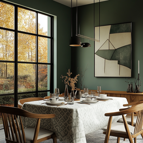a photo of A lens with a focal length of 16-35mm , best resolution , super realistic , A dining table white patterned cloth, surrounded by wooden furniture in the style of emerald color, set against a wall painted in. The room features large windows that allow sunlight to fall on it, creating a warm atmosphere. scandinavian interior, On one side is a decorative painting depicting geometric shapes in shades of gray, adding visual interest. The image also showcases focus stacking and colorism techniques.