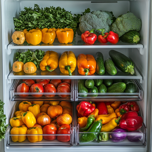 Open fridge with organized fresh vegetables, vibrant colors, clean and bright. Camera: 35mm lens, f/4, wide-angle. Style: vibrant, playful, clean lines. Post-process: soft shadows, enhanced colors