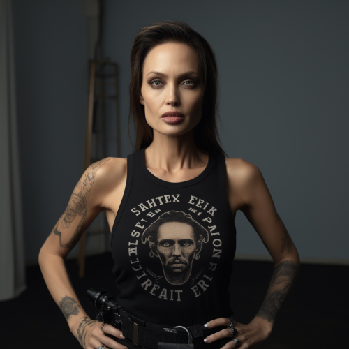 ultra sharp, 8k, Angelina Jolie, stunning look, punk look, on camera flash, shot on 35mm in small black tank top that says "I LOVE SEKRIT SAINTS", high aperture, healthy weight