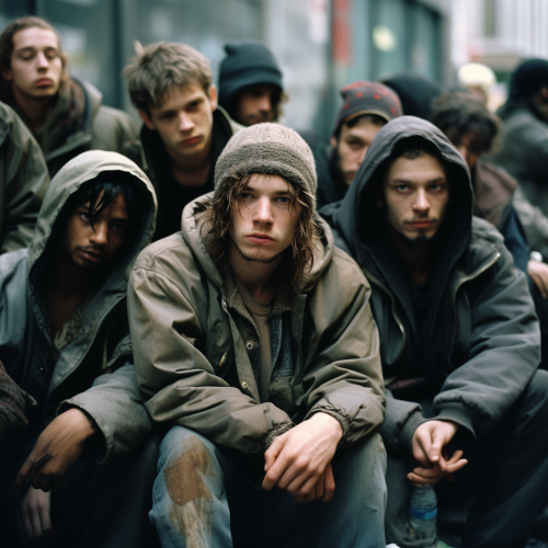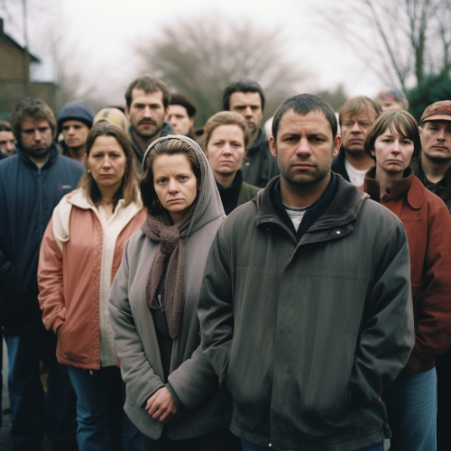 angry and sad community standing together in a 35mm film image only a few people and ensure they are diverse, v6