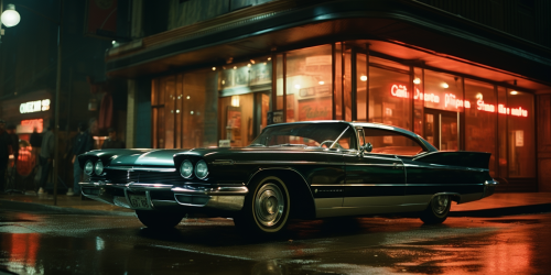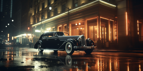 Art deco, Gotham, city streets night, retro-futurism, highest detail, cinematic light, rim light, shot on 35mm, amazing props, shot in 35mm, amazing props, 8K --ar 4:2