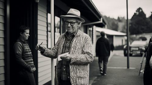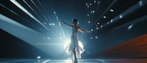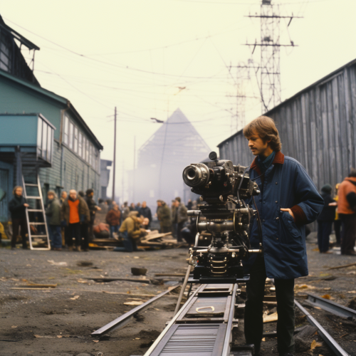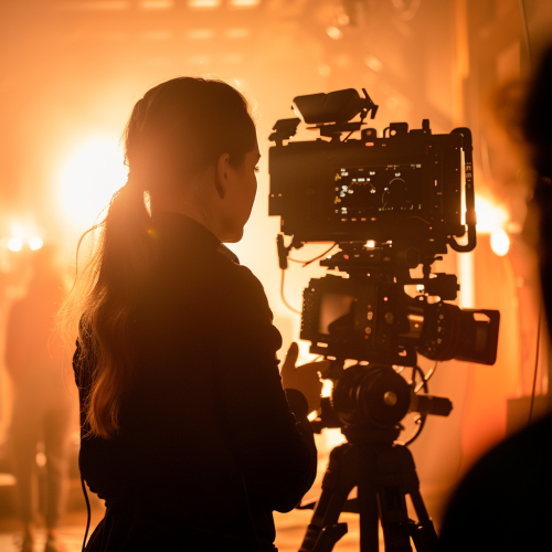 Immerse our leading lady in the enchanting world of filmmaking, where creativity unfolds on the canvas of reality. Picture her amidst the bustling energy of a film set, bathed in the mesmerizing glow of carefully orchestrated lights. In a dynamic yet subtle moment, envision her in silhouette, with one hand gracefully adjusting an iconic ARRI 35mm LF cinema camera, deeply immersed in the intricacies of a scene, and her back turned to the camera. Dressed comfortably in everyday film industry attire, she embodies both authority and approachability. In the foreground, introduce another captivating figure--a Brazilian woman with a rich, mocha complexion, short and sleek hair, radiating the warmth and vibrancy of her culture. Together, their silhouettes become focal points against the backdrop of the set's vibrant activity--a living, breathing testament to the magic of filmmaking, with a touch of Brazilian flair. Infuse an artistic touch by incorporating elements of movement, capturing the hustle and bustle of the diverse crew in action. This unique image transcends a static portrayal, inviting viewers into the heart of the cinematic process. The collaborative dance of these two women, each contributing their unique essence, tells a story of dedication and passion. With our leading lady in silhouette, adjusting the ARRI 35mm LF, she signifies a tangible connection to the filmmaking craft. This snapshot is designed to showcase their involvement and convey the vibrant, diverse spirit of our filmmaking endeavors for our production company's Instagram