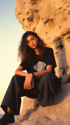 35mm faded photo of beautiful 1990s female model sat on the rocks in san antonio ibiza at sunrise 35mm vintage faded photo --ar 9:16