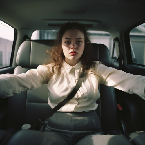 Seated in a car on the driver’s seat, unable to drive for very big arms, huge, heavy arms, big hands, white car, horror, pain to drive, anxiety, photo shoot with Pentax ME 35mm Film Camera