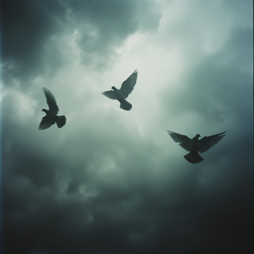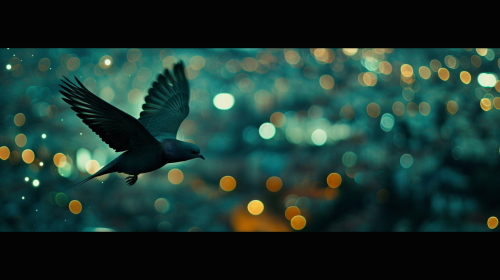 A bluebird flying through a city at night. In the style of David Fincher. Dark, moody, atmospheric, cinematic. 35mm filmstock. --ar 16:9