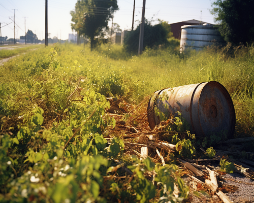 bourbon barrel, outskirts of town, trash, debris, vacant, green weeds, 35mm kodachrome, grainy, lightleak --ar 5:4 --v 5.1
