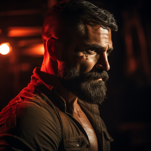 a handsome brazilian man, bearded, bodybuilder, portrait, dramatic lighting, tough, intense. 35mm, portrait