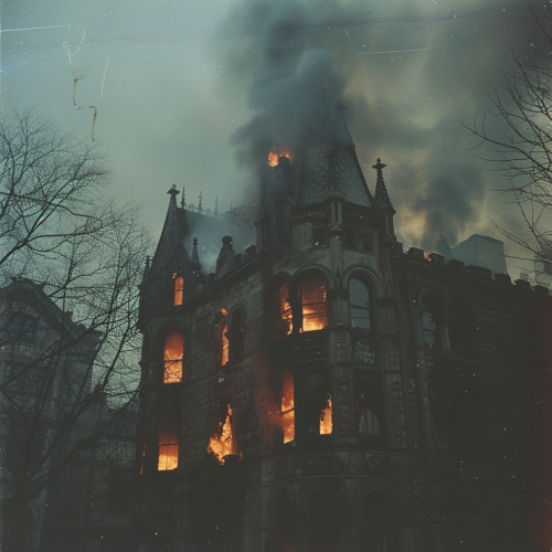 35mm film strip, the cells showing a burning man, spliced in over his face is another film cell of smiling women, photorealistic, portrait poster, film grain, kodak stock