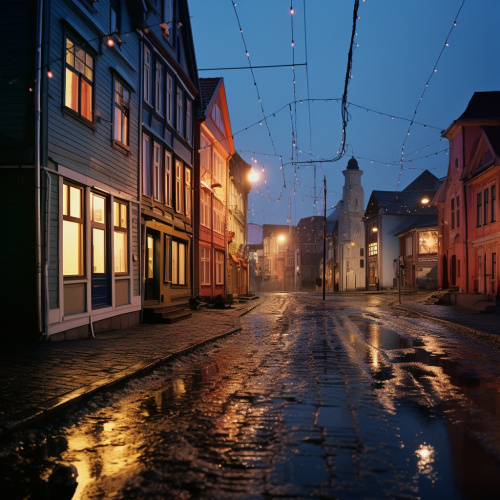 A n old photography shot in 35mm wiith colours of agfa vista. The city center of Qalipaq (An imaginary capital city of an imaginary artcic isolated country of Friheim country. The photograph is realistic panoramic photography. The arcitecture is something mix of İnuit and Nordic architecture