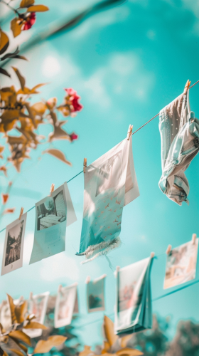 a cute picture of a clothes line. There are multiple photos on the line showing inspirational scenes. Taken from a low angle with a 35mm lens. Teal as the dominant color --ar 9:16 --v 6.0
