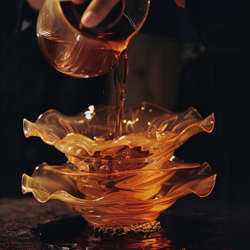 a person pouring coffee into a drip coffee maker, in the style of wavy resin sheets, light brown and dark black, raw authenticity, bold yet graceful, subtle lighting contrasts, sharp focus, open form, A realistic photo with a sensory experience on a black background, shot on an analouge 1970's fujifilm camera on 35mm film --style raw