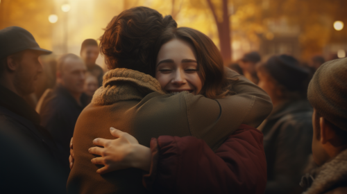 a crowd hugging in ultrarealistic cinematic glow 4K 35mm --style raw --ar 16:9