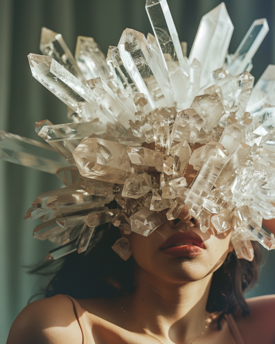 A beautiful woman in a surrealist setting. She is wearing beautiful rhinestone sunglasses. The outline of the left eye of the sunglasses is in the shape of a distorted dripping clock. Inspired by the clock found Salvador Dali the persistence of memory. The sunglasses are of the highest quality and resemble a bespoke luxury item. The shot is up close of her face. She is outside in the mid afternoon sun. In the style of 35mm film. sharp and Hyperrealistic :5 up close, centered, award-winning cinematography, award-winning photography, Canon EOS 5D Mark IV DSLR, f/8, ISO 100, 1/250 second, 18mm lens::3 blurry, dim, uninspired::-2 --s 750 --v 6.0
