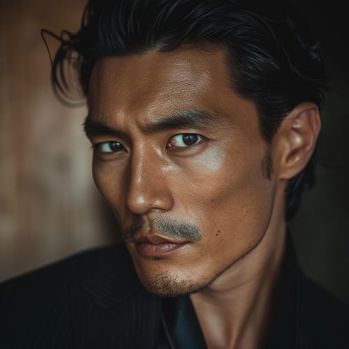 an image of an asian man with sharp and chiseled jawline, looking elegant and classy, defined jawline, detail, canon eos r5, 35mm f/1.8 lens, hyper realistic, good lighting, light background