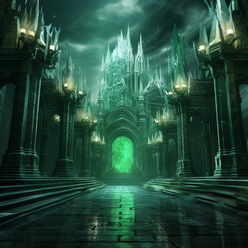 a cinematic scene of the Emerald Towers of the Oz Castle, creating a majestic and mysterious aura. The entire castle is completely empty and uninhabited, leaving an impression of profound silence. The scene unfolds as if one were exploring the palace courtyards, with a mysterious ambiance permeating every corner. Light mist drifts through the empty corridors, adding to the mystical atmosphere of the place. The sky is tinged with a rosy hue, resembling the onset of a sunset. The scene is captured with hyper-realistic precision using a Canon EOS equipped with a Canon EF 16-35mm f/2.8L III USM lens, creating a photographic style that defies reality, reminiscent of 35mm film, with a 9k resolution and dynamic lighting in a 2:1 aspect ratio.