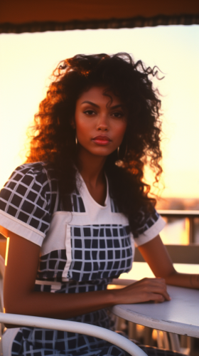 35mm faded photo of beautiful 1990s female model sat on on chair outside cafe del mar ibiza at sunrise 35mm vintage faded photo --ar 9:16