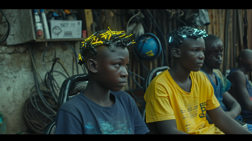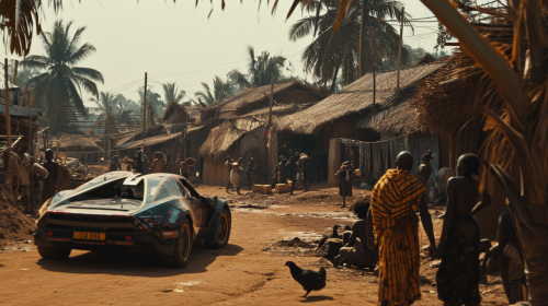 35mm cinematic film still of a futuristic science fiction village in africa in 2300, traditional mud houses, nigerian teenagers on a farm hunting chickens, big electronic cars, drought, sunny, neon hairstyles, nigerian lagos people, future technology, wires and tubes, african culture, palmtrees, filmed by [Denis Villeneuve], A cinematic moment captured on cinestill 50d film --ar 16:9 --style raw --v 6.0