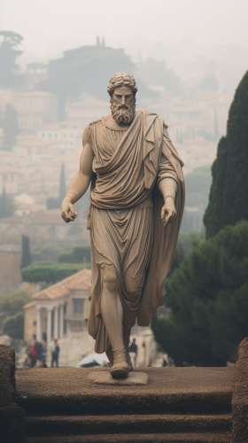 Realistic 35mm photo of a greek statue walking through ancient rome --ar 9:16