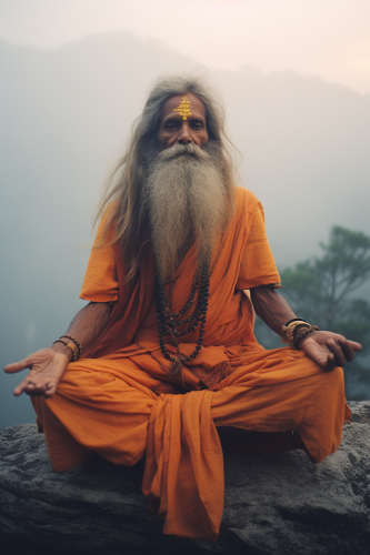 candid closeup photo of a indian saint sadhu wearing saffron outfit doing yoga:: sitting on top of a mountain, futuristic yoga fashion, symmetry, france, foggy, pastel colors, vintage 35 mm fuji color film --ar 2:3 --v 5.2