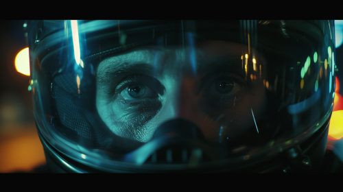 Extreme close-up of a man's eyes behind his motorcycle visor at night. In the style of David Fincher. Dark, moody, atmospheric, cinematic. 35mm filmstock. --ar 16:9