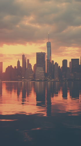 35mm faded photograph 1980s manhattan skyline in autumn at dusk, long exposure 35mm faded vintage photo --ar 9:16