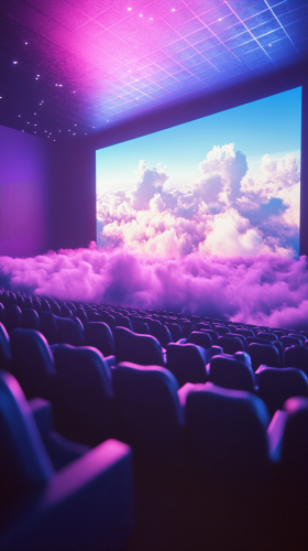 a minimalist light purple cinema with a screen showing clouds images, 35mm film, creating soft shadows, objects have glowing haze around, realistic, --ar 9:16