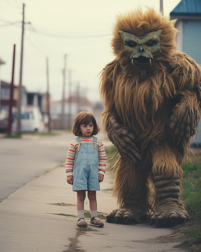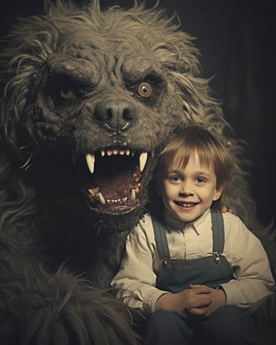 grotesque horror vintage photo of a child and his monster pet, 80s vintage, canon eos 5d mark iv --ar 4:5 --s 250