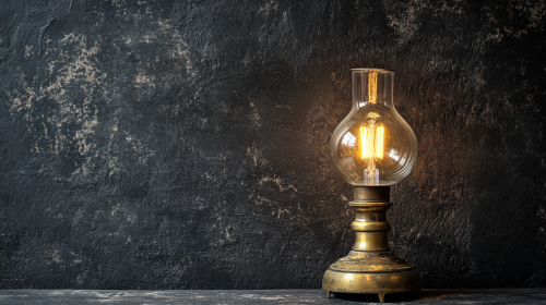 vintage brass lamp w/ glass chimney open from above, old oil lamp, Vintage Electric Lamp Glowing In The Dark black Background cracks in the wall --ar 16:9