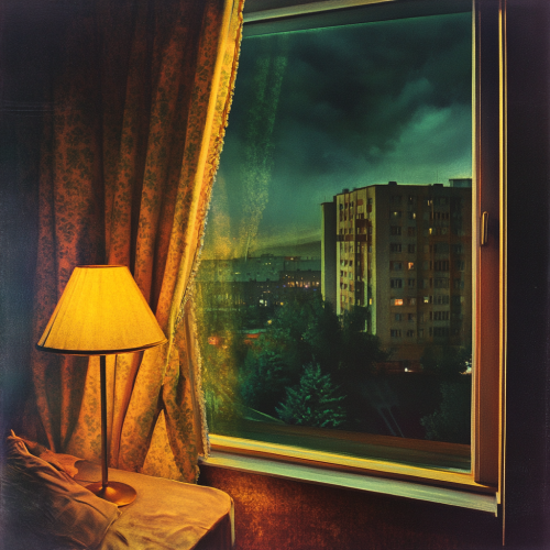 High quality, masterpiece, 1980's vintage, airbrushed artwork, hotelroom, 1980's vintage art, gloomy vibe, no human, night view from a hotel room window,melancholy