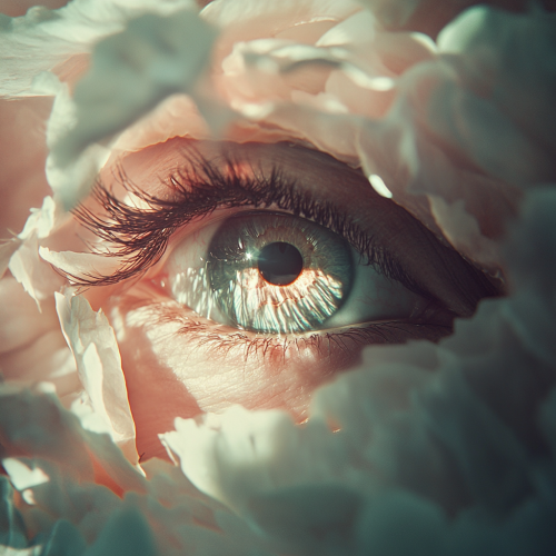 blooming peony, a bright shiny eye in the middle of the vintage peony, vintage look, fish eye effect, bohemian look, muted color, fantasy. Faded image, hyper realistic, beautiful light.