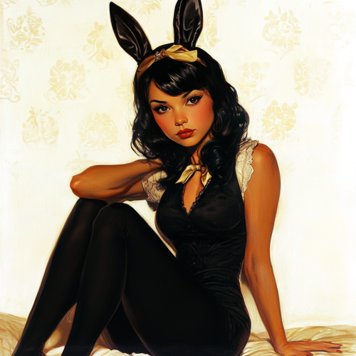 play bunny, vintage poster woman, black hair, vintage poster girl, cool pose, realistic, plain white background, in the style of Frank Frazetta, vintage, colour