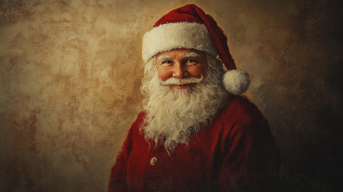 A vintage oil painting with visible brush strokes and characteristics of a vintage painting. santa wearing Neutral colours. include textured background. soft glow lighting. classic vintage style --ar 16:9