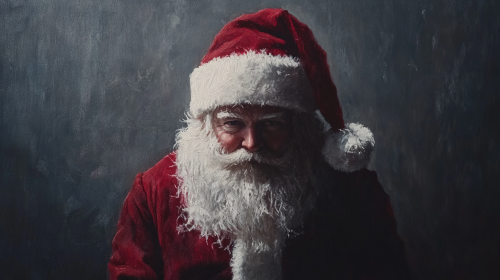 A vintage oil painting with visible brush strokes and characteristics of a vintage painting. santa wearing beigh coat and hat. include textured dark grey background. soft glow lighting. classic vintage style --ar 16:9