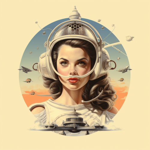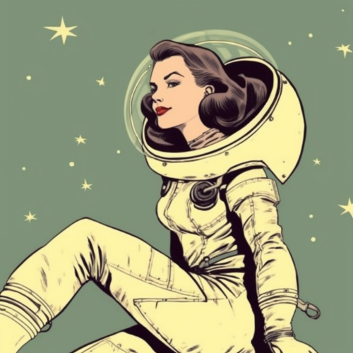 vintage comic of full body astronaut babe in space, vintage pin up style, simple lines, flat colors, black outline, simple details, cute face, moon over miami, old school print advertisement poster, vintage art deco style, old book cover design, vintage look --v 5.0