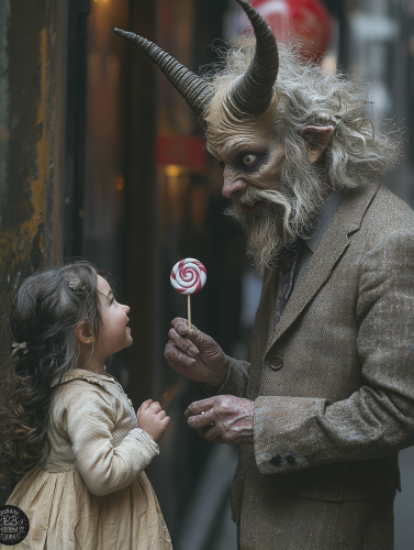 Vintage photo of an evil-looking old man wearing a suit and tie with horns, handing to a child a lollipop, with a 1960s aesthetic, vintage film grain, and a vintage feel, shot with leica m3 --ar 3:4 --s 750 --q 2