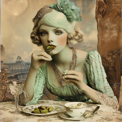 1920s tiramisu woman, dessert sculpture, vintage photography, realistic textures, pop surrealism, pistachio, Italian vintage posters, colors: cream, green, brown