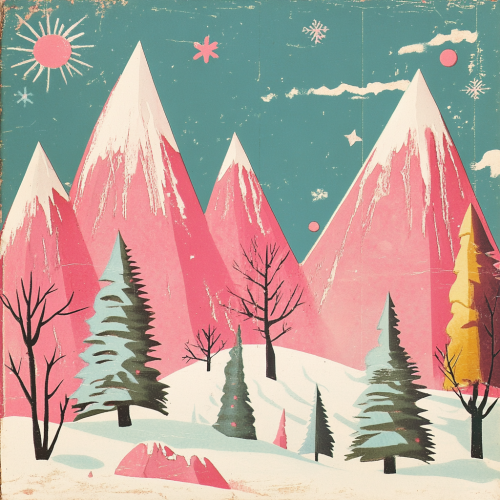 vintage mid century style illustration of pink mountains vintage Christmas card style with pink icing instead of snow caps in vintage child like illustration style for Christmas cards