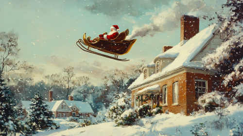 vintage painting, classic christmas style, santa riding sleigh over a house on a snowy morning. winter season, chritmas day. classic vintage. --ar 16:9