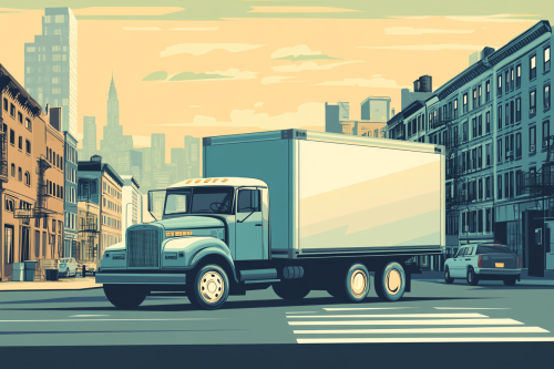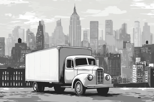design a Vintage and eye catching advertisement for a shipping service, cool pallete, incorporate NYC and NJ urban elements, Vintage Box Truck, Vector, Vintage Cartoon design aesthetic, --ar 3:2 --v 6.1